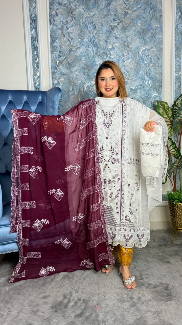 এই কালেকশনের প্রতিটি ড্রেস তৈরি হয়েছে ইন্ডিয়ান হোয়াইট গোল জর্জেট ফেব্রিক দিয়ে — যা এর আকর্ষণীয় টেক্সচার, মসৃণতা এবং প্রিমিয়াম লুকের জন্য সুপরিচিত।